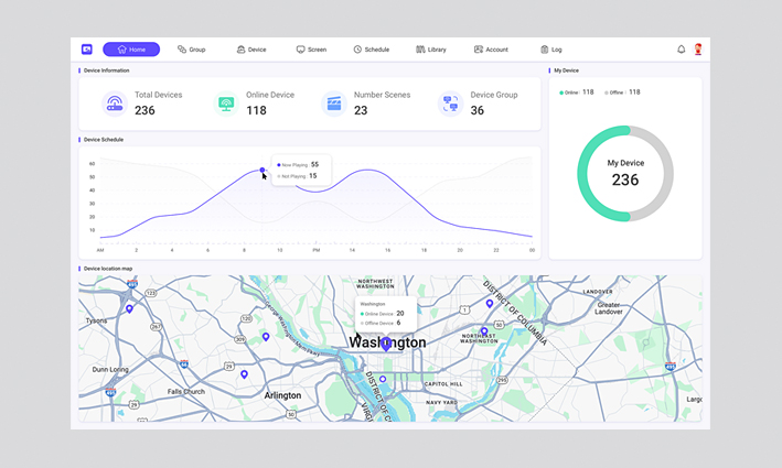 V jednom jedinom nástroji spravujete všetky obrazovky na celej škole, univerzite alebo vo firme. Spravujete svoju knižnicu materiálov, spôsob zobrazenia aj užívateľské účty. Vďaka usporiadaniu jednotlivých obrazoviek do skupín získate kontrolu nad obsahom mnohých zariadení naraz, vyriešite aktualizáciu, vypnete obrazovku na diaľku a pod.